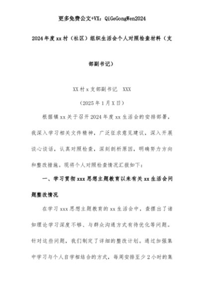 【七哥公文】2025年:2024年度xx村(社区)组织生活会个人对照检查材料(支部副书记)+更多免费公文+VX:QiGeGongWen2024+更多免费公文+VX:QiGeGongWen2024