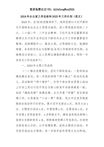 【七哥公文】2025年:2024年办公室工作总结和2025年工作计划(范文)+更多免费公文+VX:QiGeGongWen2024+更多免费公文+VX:QiGeGongWen2024