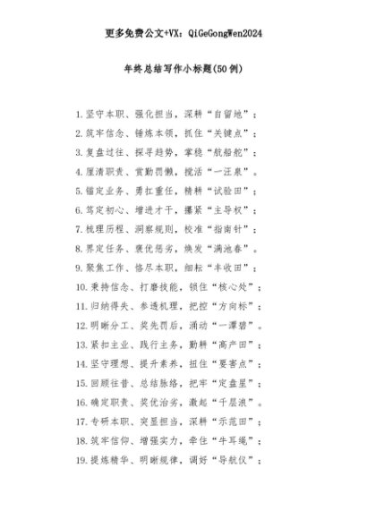 【七哥公文】2025年:(50例)年终总结写作小标题+更多免费公文+VX:QiGeGongWen2024+更多免费公文+VX:QiGeGongWen2024