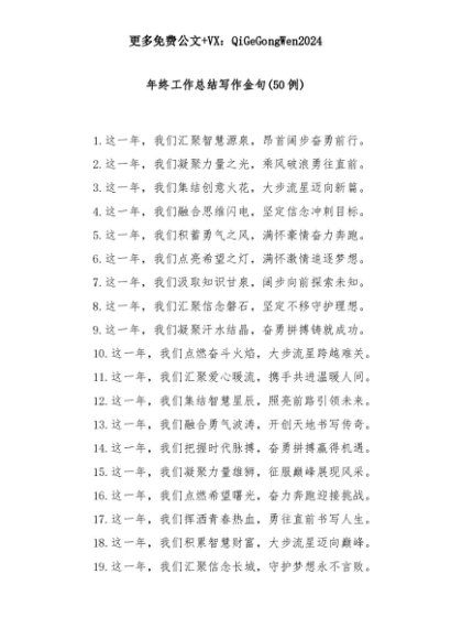 【七哥公文】2025年:(50例)年终工作总结写作金句+更多免费公文+VX:QiGeGongWen2024+更多免费公文+VX:QiGeGongWen2024