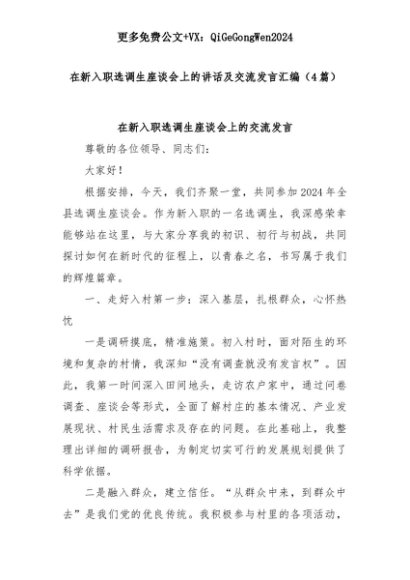 【七哥公文】2025年:(4篇)在新入职选调生座谈会上的讲话及交流发言汇编+更多免费公文+VX:QiGeGongWen2024+更多免费公文+VX:QiGeGongWen2024