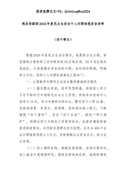 【七哥公文】2025年:税务局副职2024年度民主生活会个人对照检视发言材料(四个带头)+更多免费公文+VX:QiGeGongWen2024+更多免费公文+VX:QiGeGongWen2024