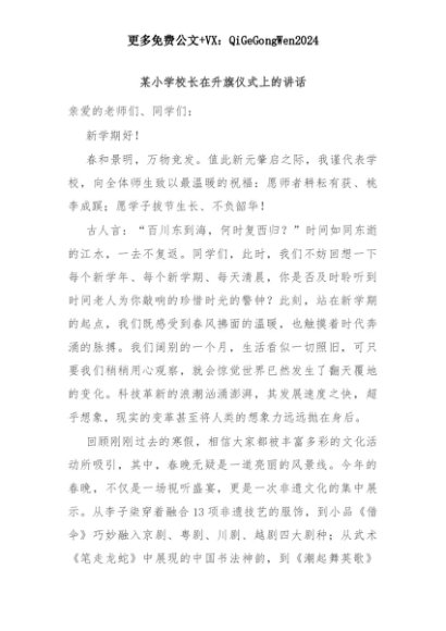 【七哥公文】2025年:某小学校长在升旗仪式上的讲话+更多免费公文+VX:QiGeGongWen2024+更多免费公文+VX:QiGeGongWen2024