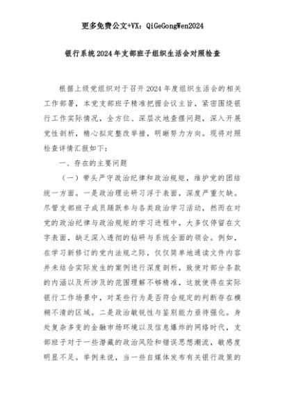 【七哥公文】2025年:银行系统2024年支部班子组织生活会对照检查+更多免费公文+VX:QiGeGongWen2024+更多免费公文+VX:QiGeGongWen2024