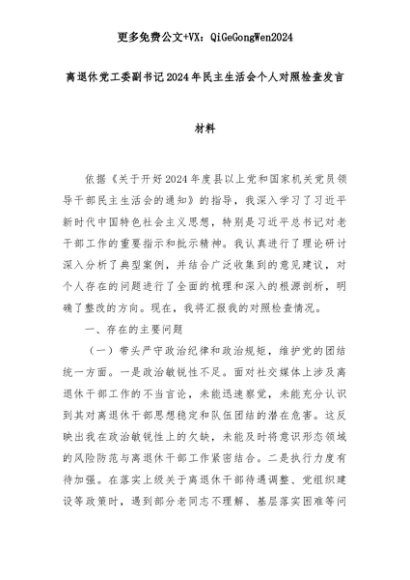 【七哥公文】2025年:离退休党工委副书记2024年民主生活会个人对照检查发言材料+更多免费公文+VX:QiGeGongWen2024+更多免费公文+VX:QiGeGongWen2024