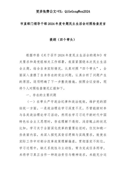 【七哥公文】2025年:市直部门领导干部2024年度专题民主生活会对照检查发言提纲(四个带头)+更多免费公文+VX:QiGeGongWen2024+更多免费公文+VX:QiGeGongWen2024