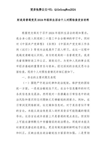 【七哥公文】2025年:财政局普通党员2024年组织生活会个人对照检查发言材料+更多免费公文+VX:QiGeGongWen2024+更多免费公文+VX:QiGeGongWen2024