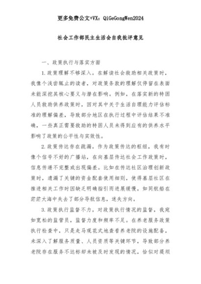 【七哥公文】2025年:社会工作部民主生活会自我批评意见+更多免费公文+VX:QiGeGongWen2024+更多免费公文+VX:QiGeGongWen2024