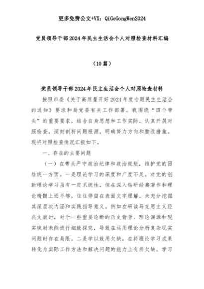 【七哥公文】2025年:(10篇)党员领导干部2024年民主生活会个人对照检查材料汇编+更多免费公文+VX:QiGeGongWen2024+更多免费公文+VX:QiGeGongWen2024