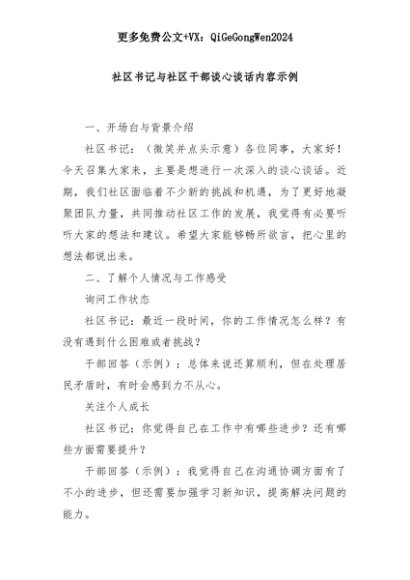 【七哥公文】2025年:社区书记与社区干部谈心谈话内容示例+更多免费公文+VX:QiGeGongWen2024+更多免费公文+VX:QiGeGongWen2024