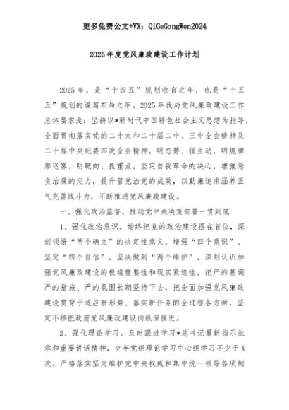 【七哥公文】2025年:2025年度党风廉政建设工作计划+更多免费公文+VX:QiGeGongWen2024+更多免费公文+VX:QiGeGongWen2024