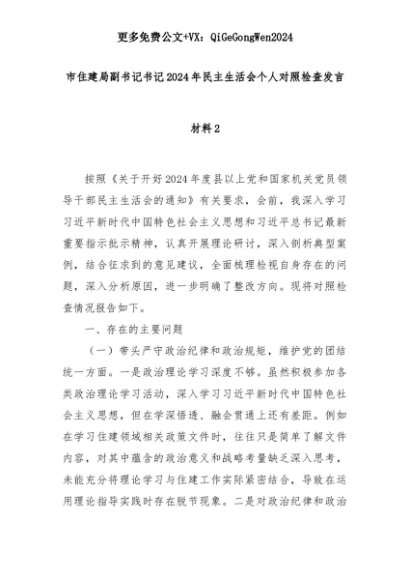 【七哥公文】2025年:市住建局副书记书记2024年民主生活会个人对照检查发言材料2+更多免费公文+VX:QiGeGongWen2024+更多免费公文+VX:QiGeGongWen2024