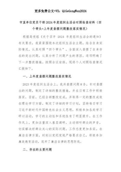 【七哥公文】2025年:市直单位党员干部2024年度组织生活会对照检查材料(四个带头+上年度查摆问题整改落实情况)+更多免费公文+VX:QiGeGongWen2024+更多免费公文+VX:QiGeGongWen2024
