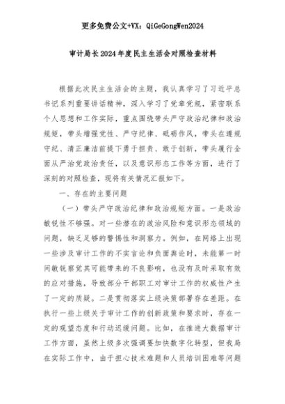 【七哥公文】2025年:审计局长2024年度民主生活会对照检查材料+更多免费公文+VX:QiGeGongWen2024+更多免费公文+VX:QiGeGongWen2024