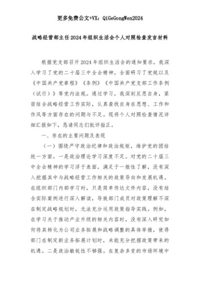 【七哥公文】2025年:战略经营部主任2024年组织生活会个人对照检查发言材料+更多免费公文+VX:QiGeGongWen2024+更多免费公文+VX:QiGeGongWen2024