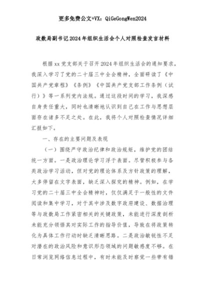 【七哥公文】2025年:政数局副书记2024年组织生活会个人对照检查发言材料+更多免费公文+VX:QiGeGongWen2024+更多免费公文+VX:QiGeGongWen2024