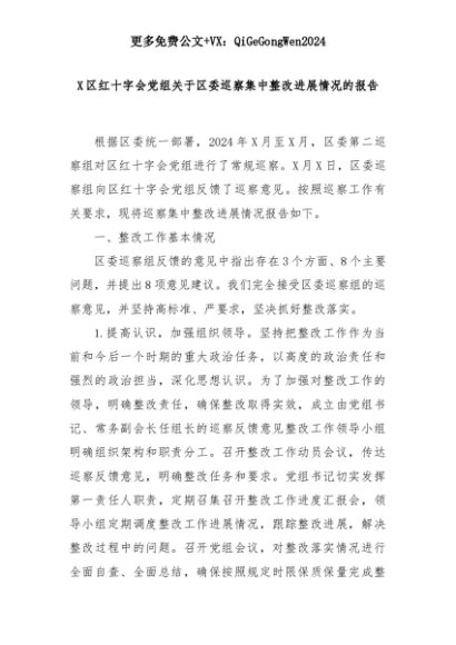 【七哥公文】2025年:X区红十字会党组关于区委巡察集中整改进展情况的报告+更多免费公文+VX:QiGeGongWen2024+更多免费公文+VX:QiGeGongWen2024