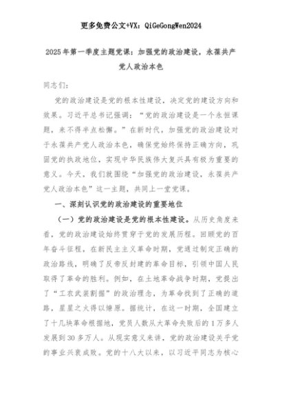 【七哥公文】2025年:2025年第一季度主题党课:加强党的政治建设,永葆共产党人政治本色+更多免费公文+VX:QiGeGongWen2024+更多免费公文+VX:QiGeGongWen2024