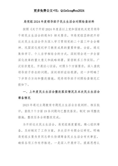 【七哥公文】2025年:局党组2024年度领导班子民主生活会对照检查材料+更多免费公文+VX:QiGeGongWen2024+更多免费公文+VX:QiGeGongWen2024
