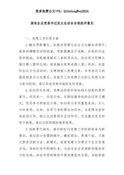 【七哥公文】2025年:国有企业党委书记民主生活会自我批评意见+更多免费公文+VX:QiGeGongWen2024+更多免费公文+VX:QiGeGongWen2024