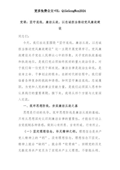【七哥公文】2025年:党课:坚守底线,廉洁从政,以忠诚担当推动党风廉政建设+更多免费公文+VX:QiGeGongWen2024+更多免费公文+VX:QiGeGongWen2024