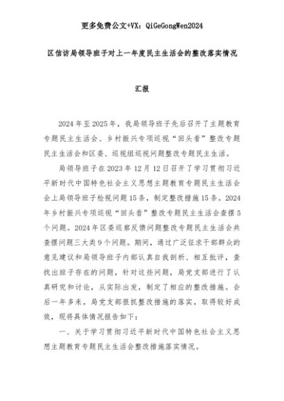 【七哥公文】2025年:区信访局领导班子对上一年度民主生活会的整改落实情况汇报+更多免费公文+VX:QiGeGongWen2024+更多免费公文+VX:QiGeGongWen2024