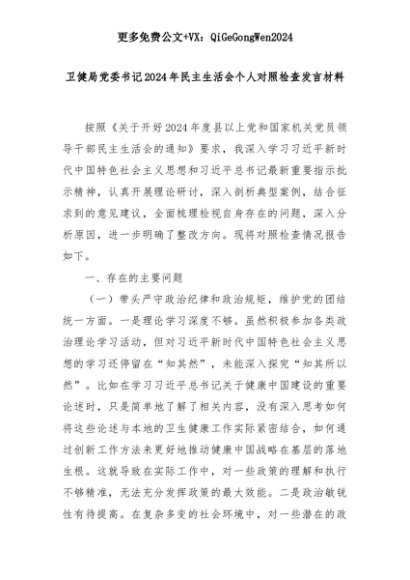 【七哥公文】2025年:卫健局党委书记2024年民主生活会个人对照检查发言材料+更多免费公文+VX:QiGeGongWen2024+更多免费公文+VX:QiGeGongWen2024