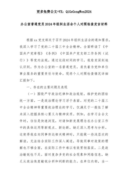 【七哥公文】2025年:办公室普通党员2024年组织生活会个人对照检查发言材料+更多免费公文+VX:QiGeGongWen2024+更多免费公文+VX:QiGeGongWen2024