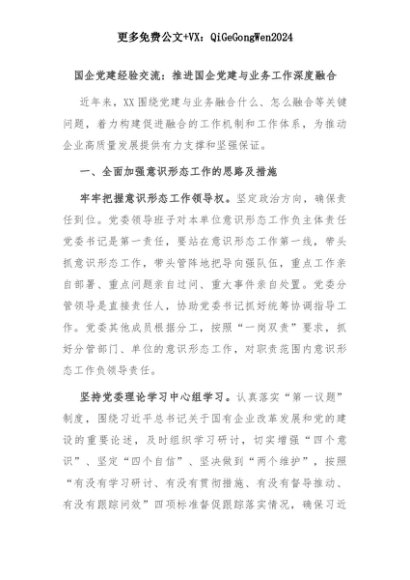 【七哥公文】2025年:国企党建经验交流:推进国企党建与业务工作深度融合+更多免费公文+VX:QiGeGongWen2024+更多免费公文+VX:QiGeGongWen2024