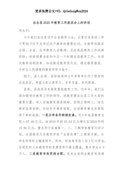 【七哥公文】2025年:在全县2025年教育工作座谈会上的讲话+更多免费公文+VX:QiGeGongWen2024+更多免费公文+VX:QiGeGongWen2024