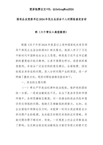 【七哥公文】2025年:国有企业党委书记2024年民主生活会个人对照检查发言材料(六个带头+典型案例)+更多免费公文+VX:QiGeGongWen2024+更多免费公文+VX:QiGeGongWen2024