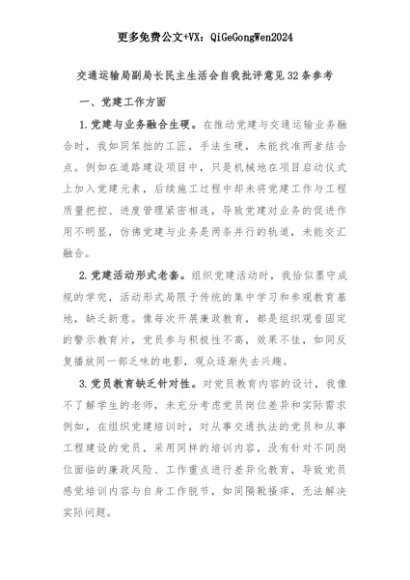 【七哥公文】2025年:交通运输局副局长民主生活会自我批评意见32条参考+更多免费公文+VX:QiGeGongWen2024+更多免费公文+VX:QiGeGongWen2024