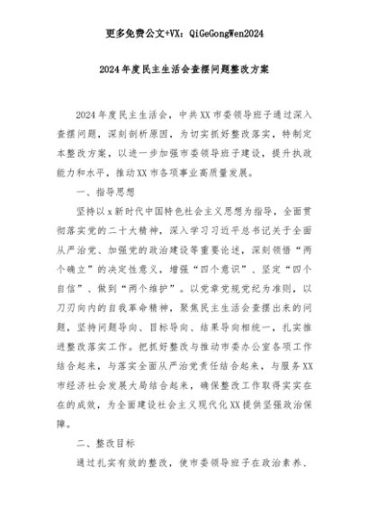 【七哥公文】2025年:2024年度民主生活会查摆问题整改方案+更多免费公文+VX:QiGeGongWen2024+更多免费公文+VX:QiGeGongWen2024