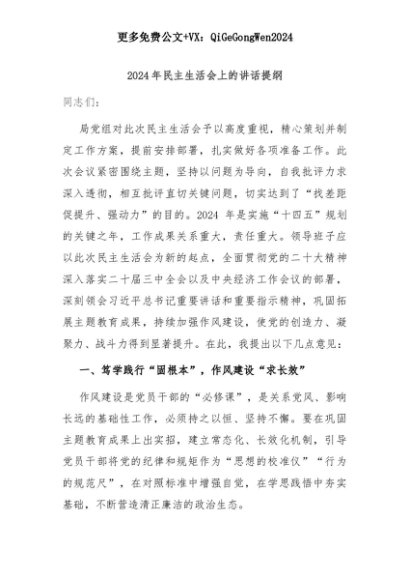【七哥公文】2025年:2024年民主生活会上的讲话提纲+更多免费公文+VX:QiGeGongWen2024+更多免费公文+VX:QiGeGongWen2024