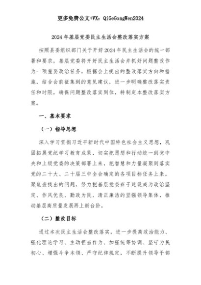 【七哥公文】2025年:2024年基层党委民主生活会整改落实方案+更多免费公文+VX:QiGeGongWen2024+更多免费公文+VX:QiGeGongWen2024