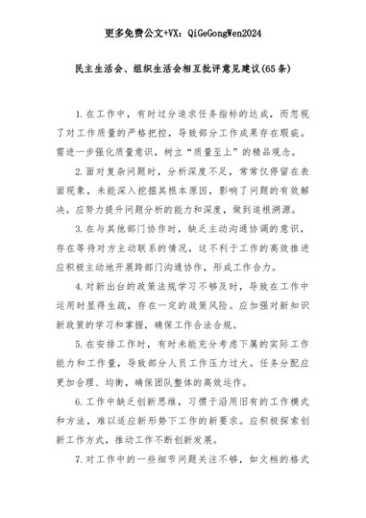 【七哥公文】2025年:(65条)民主生活会、组织生活会相互批评意见建议+更多免费公文+VX:QiGeGongWen2024+更多免费公文+VX:QiGeGongWen2024