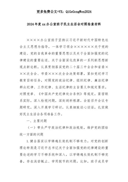 【七哥公文】2025年:2024年度xx办公室班子民主生活会对照检查材料+更多免费公文+VX:QiGeGongWen2024+更多免费公文+VX:QiGeGongWen2024