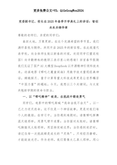【七哥公文】2025年:党委副书记、校长在2025年春季开学典礼上的讲话:智创未来共铸华章+更多免费公文+VX:QiGeGongWen2024+更多免费公文+VX:QiGeGongWen2024