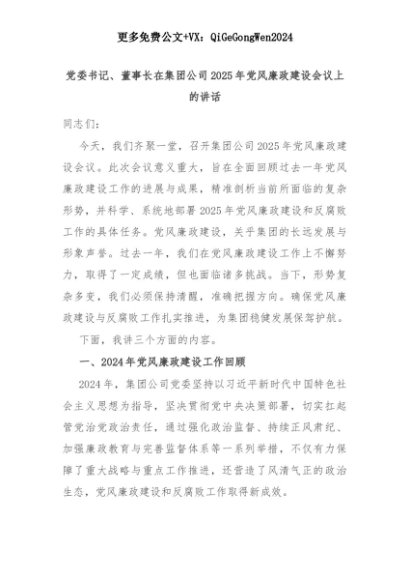 【七哥公文】2025年:党委书记、董事长在集团公司2025年党风廉政建设会议上的讲话+更多免费公文+VX:QiGeGongWen2024+更多免费公文+VX:QiGeGongWen2024