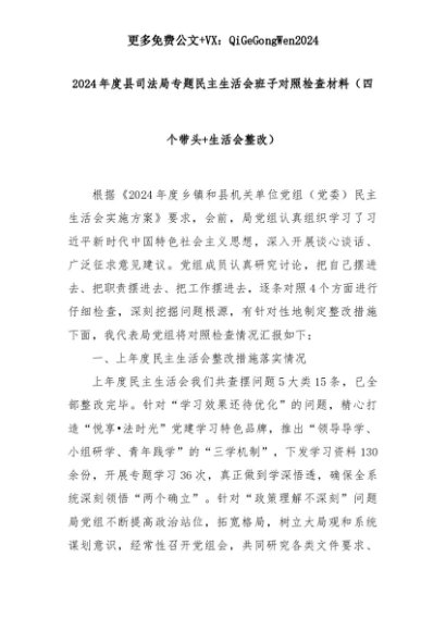 【七哥公文】2025年:2024年度县司法局专题民主生活会班子对照检查材料(四个带头+生活会整改)+更多免费公文+VX:QiGeGongWen2024+更多免费公文+VX:QiGeGongWen2024