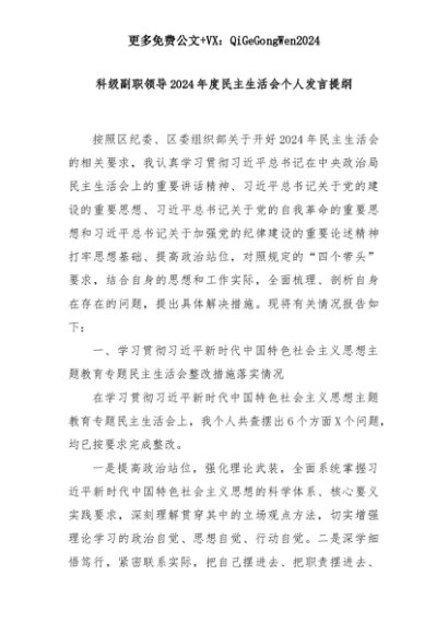 【七哥公文】2025年:科级副职领导2024年度民主生活会个人发言提纲+更多免费公文+VX:QiGeGongWen2024+更多免费公文+VX:QiGeGongWen2024