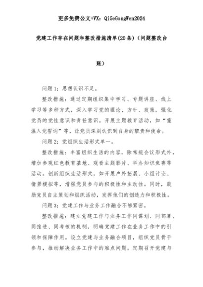 【七哥公文】2025年:(20条)党建工作存在问题和整改措施清单(问题整改台账)+更多免费公文+VX:QiGeGongWen2024+更多免费公文+VX:QiGeGongWen2024