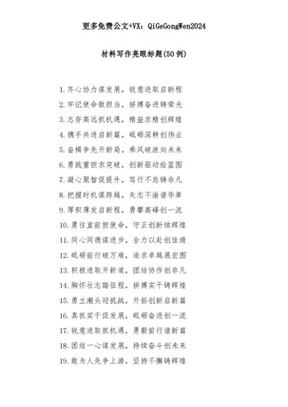 【七哥公文】2025年:(50例)材料写作亮眼标题+更多免费公文+VX:QiGeGongWen2024+更多免费公文+VX:QiGeGongWen2024