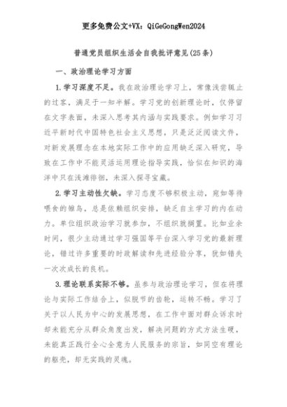 【七哥公文】2025年:(25条)普通党员组织生活会自我批评意见+更多免费公文+VX:QiGeGongWen2024+更多免费公文+VX:QiGeGongWen2024