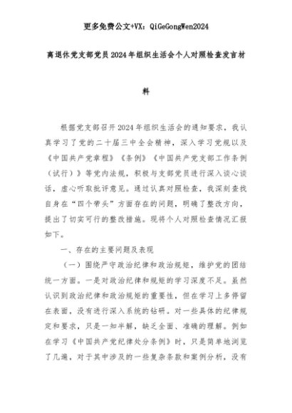 【七哥公文】2025年:离退休党支部党员2024年组织生活会个人对照检查发言材料+更多免费公文+VX:QiGeGongWen2024+更多免费公文+VX:QiGeGongWen2024
