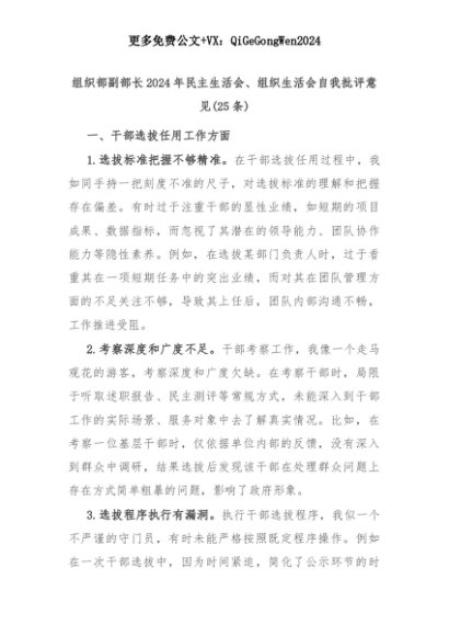 【七哥公文】2025年:(25条)组织部副部长2024年民主生活会、组织生活会自我批评意见+更多免费公文+VX:QiGeGongWen2024+更多免费公文+VX:QiGeGongWen2024