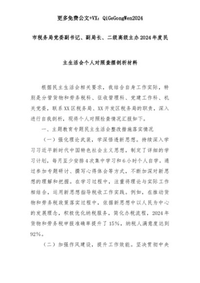 【七哥公文】2025年:市税务局党委副书记、副局长、二级高级主办2024年度民主生活会个人对照查摆剖析材料+更多免费公文+VX:QiGeGongWen2024+更多免费公文+VX:QiGeGongWen2024