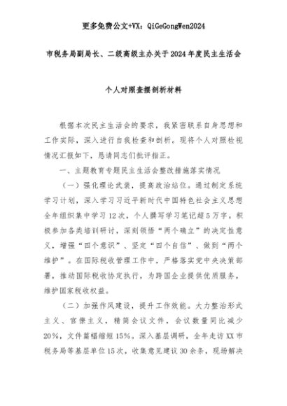 【七哥公文】2025年:市税务局副局长、二级高级主办关于2024年度民主生活会个人对照查摆剖析材料+更多免费公文+VX:QiGeGongWen2024+更多免费公文+VX:QiGeGongWen2024