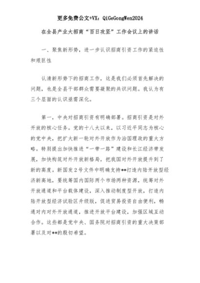 【七哥公文】2025年:在全县产业大招商“百日攻坚”工作会议上的讲话+更多免费公文+VX:QiGeGongWen2024+更多免费公文+VX:QiGeGongWen2024
