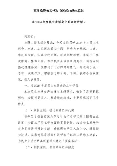 【七哥公文】2025年:在2024年度民主生活会上的点评讲话2+更多免费公文+VX:QiGeGongWen2024+更多免费公文+VX:QiGeGongWen2024